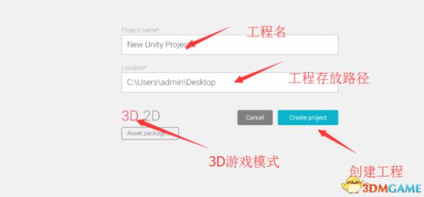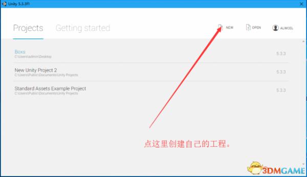 安装好Unity后,运行软件,创建工程。(我的工程名是Boxs)如下图: