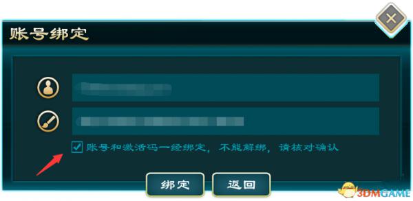 五、输入完毕后,系统会提示玩家是否确定将激活码与账号绑定,确认输入无误后勾选即可点击绑定。
