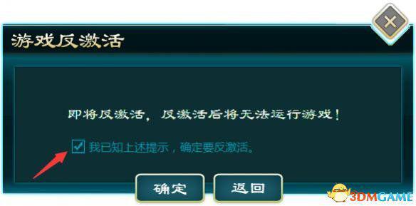 2、双击后会出现如下提示。勾选此处并点击“确定”后即开始反激活游戏;