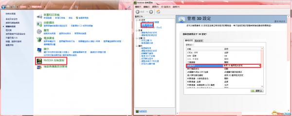 4.选择NVIDIA 控制面板,再按管理3D设定,垂直同步那裡选择使用3D应用程式设定