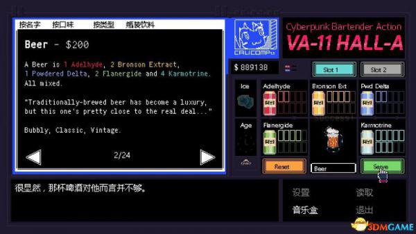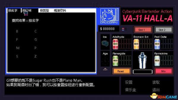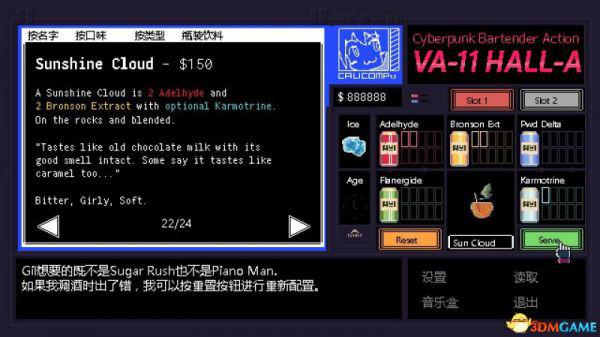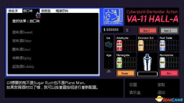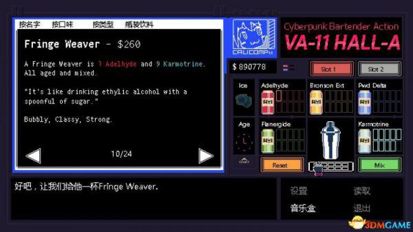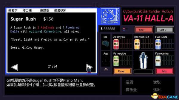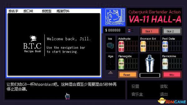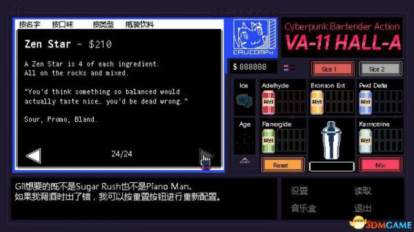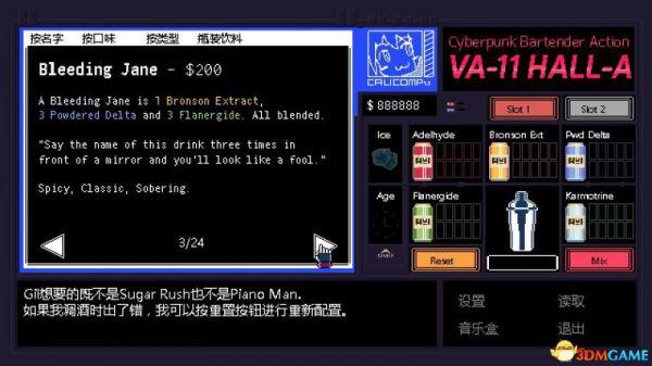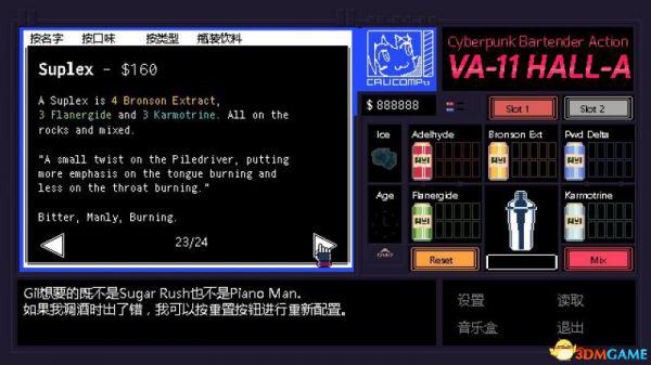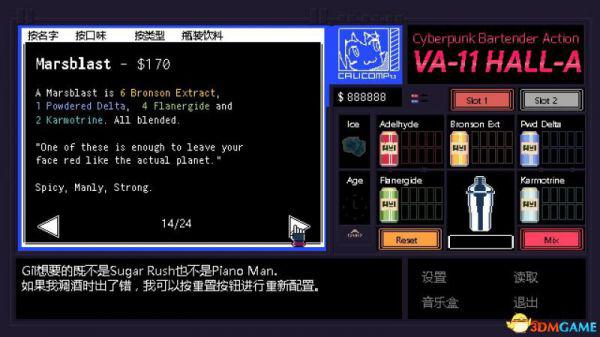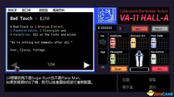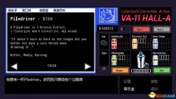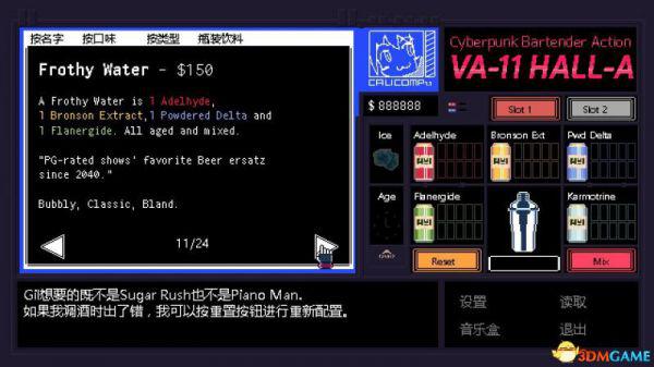 调配框:屏幕右侧为调配框,当中会显示五种调酒材料(adaelhyde、bronson ext、pwd delta、flanergide、karmotrine)、两种添加物(冰块、age)、两个槽(1槽、2槽)以及两个操作键(重置和混合)。