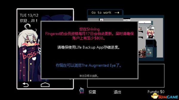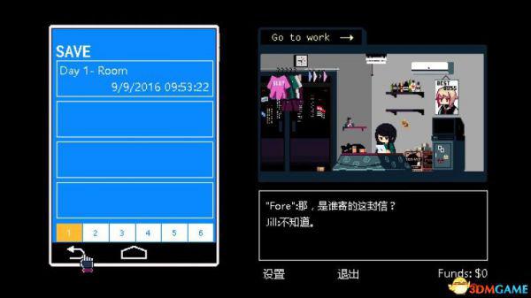 工作:屏幕右侧为工作,可以查看工作相关的信息,前往工作(度过一天),并且可以在商店购买道具(这里的钱指的是Jill自己的积蓄funds,而非酒吧营业的资金)。