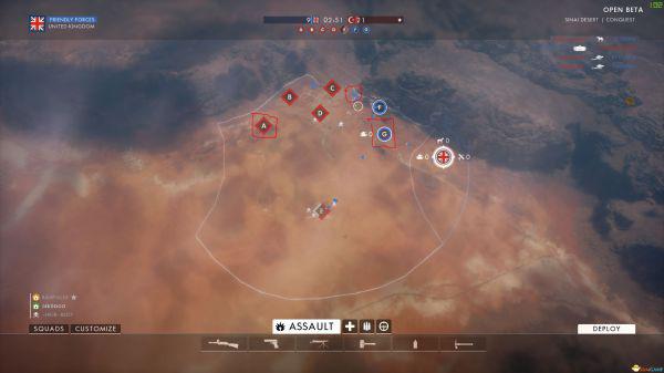 说一下如何抢坦克,坦克刷新机制,除了一开局本方基地默认出现以外,开战以后如果其他坦克阵亡90秒出一台新的,而且刷新的点奥斯曼是在A点、英国是在G点(见下图我标记的红色方块),当然前提是你方队伍要占有这个点。