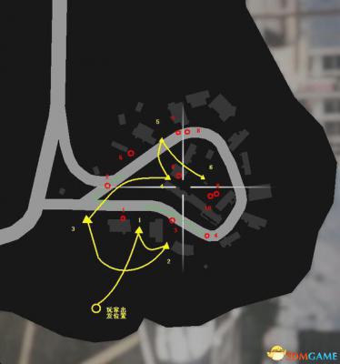 上图自己做的,红色为敌人,绿线标出了巡逻的2,4号敌人路线,黄线为玩家清场路线,使用消音冲锋枪即可,到达1号位打死1号敌人,如果2号敌人不在5号敌人视线内顺手打死,转到2号位打死修车的3号敌人,待4号敌人走过来马上看到3号敌人尸体时打死,转到3号位消灭2号敌人,然后按路走到4号位路上干掉望风的5号,6号敌人在房子里抽烟找准角度打死,切潜行模式走到5号,用冲锋枪连续打死7,8号敌人,最后走到6号位同时干掉9,10号敌人。要找的货车在6号位12点至5点方向,按顺时针寻找,一般在路对面房子边上停靠。两两一组上车最好都穿了重甲,路上敌人很多,别让货车挨太多枪,直接冲到仓库就完成了。潜入过程不如人道运送EMP难,敌人分散视野重叠的少,清场较为容易。