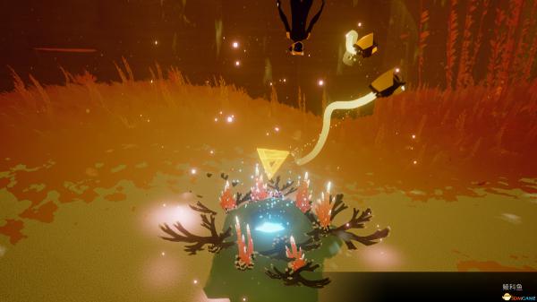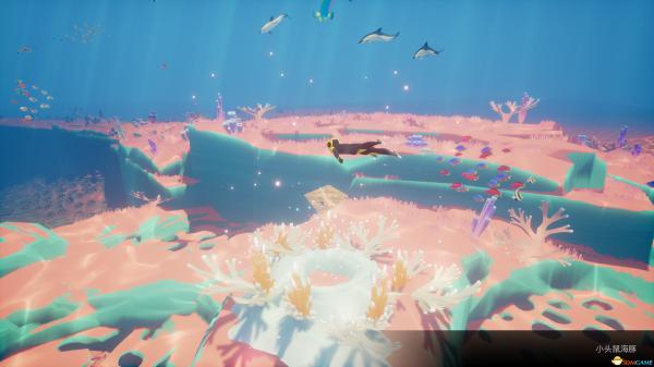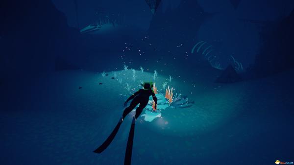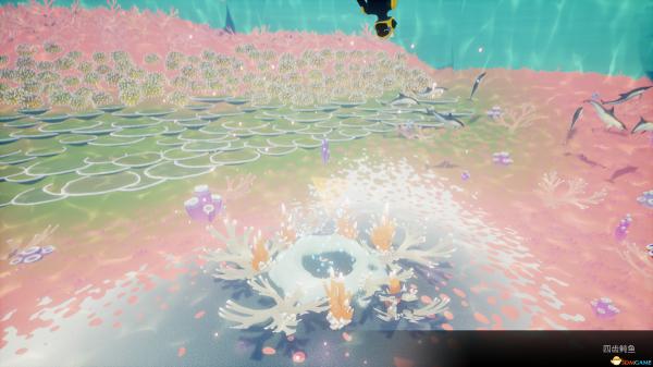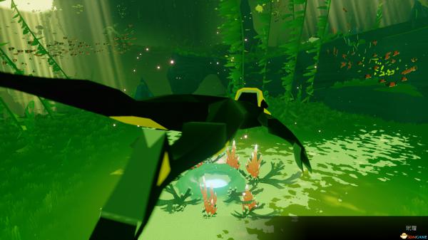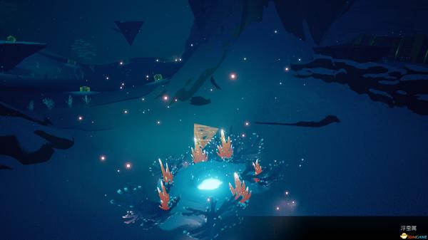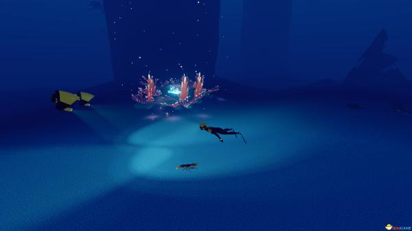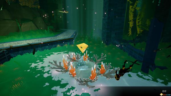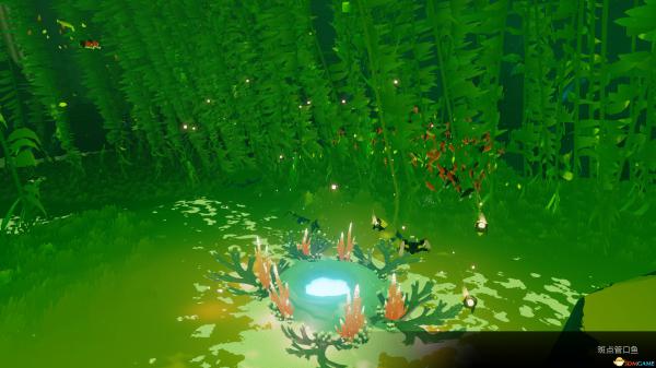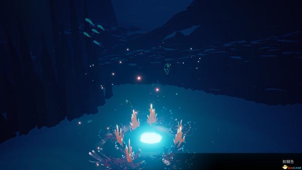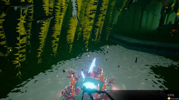 先别过去,往最下方的海草、石柱潜游,找到发光水潭。释放鲼科鱼。