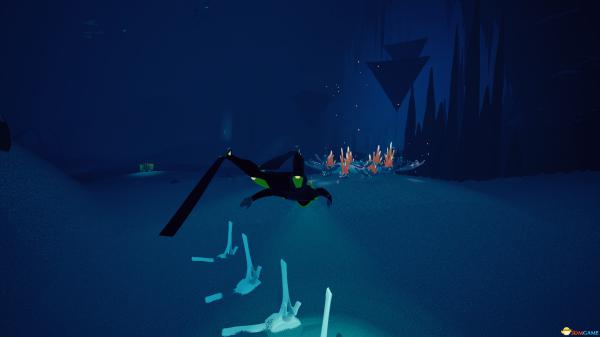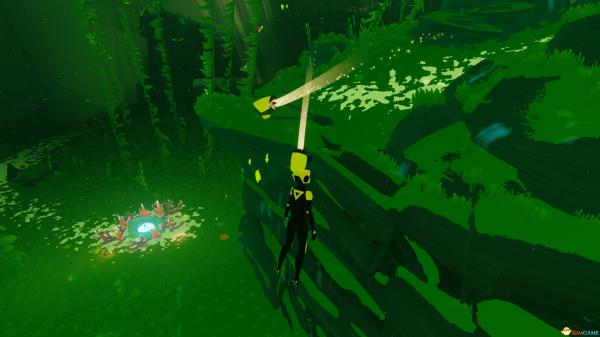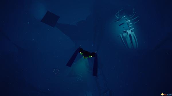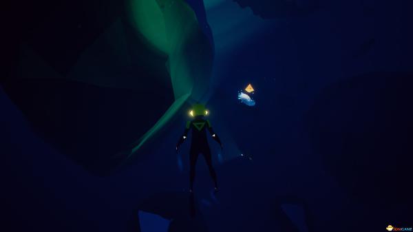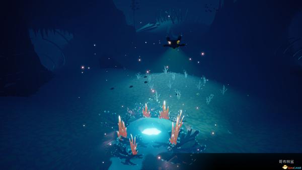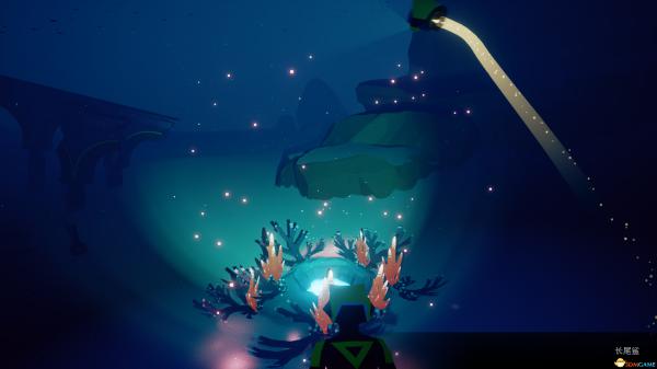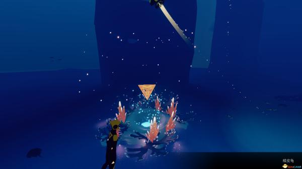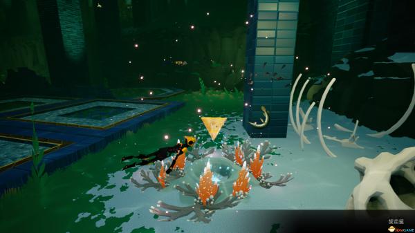 沿着右边这根石柱往下潜,很快就能看到发光的水潭。释放棱皮龟。
