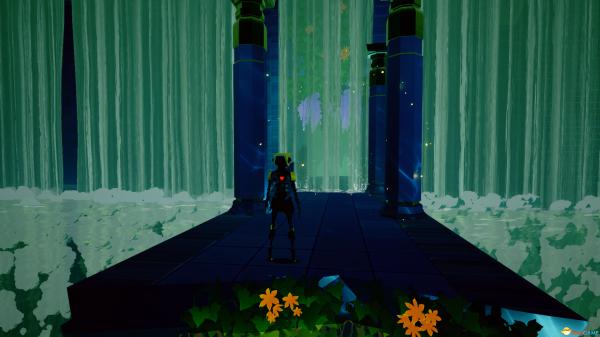 从通道出来后触发动画,前方能依稀看到金色倒三角形大门。