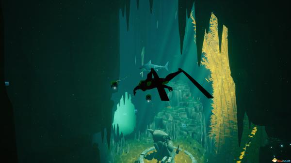 在三岔路口望向上前方,可以看到大白鲨雕像,游过去互动并进行冥想。