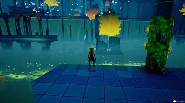 成功触发第二处链条机关后大门打开,面朝大门的右侧平台可以看见水潭。