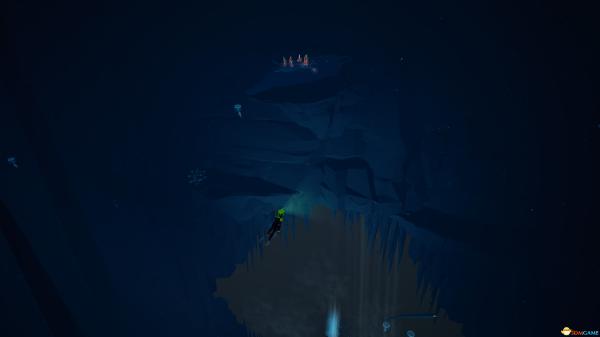从高台向下返回,左下方海底隐约可见发光水潭。