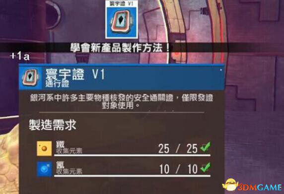 在寰宇之路会有一个类似空间站的地方,里面有2个NPC,其中一个会询问你一些信息,选择告诉它就可以获得寰宇证蓝图,然后按照要求采集相应的元素,如图所示。就可以获得寰宇证了。