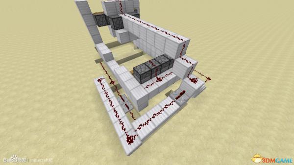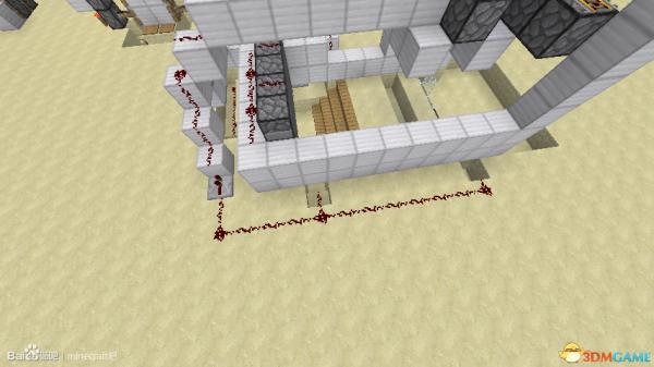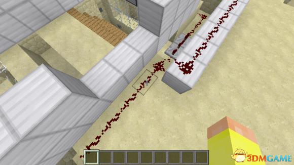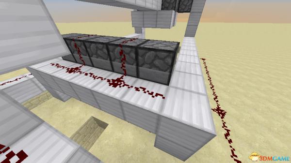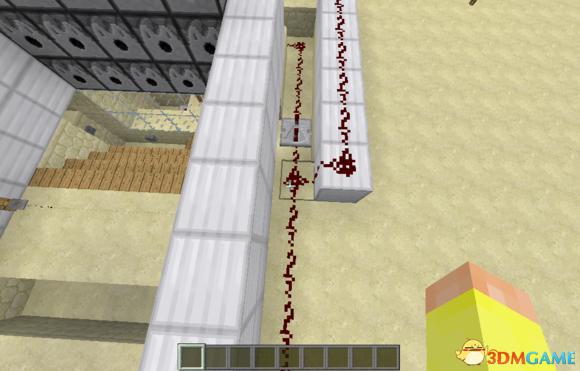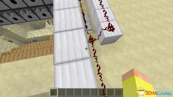 然后再上来,中间的红石线被红石线附着的地方充能,旁边的红石线也跟着被充能,最边上的两个红石同样是多余的。