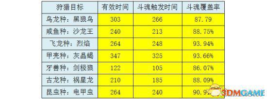 从表中可以发现,大多数怪物触发斗魂的时间都在20秒左右,基本上进去砍几刀就触发了,而且中途也不会断,打到死都还在发怒,所以斗魂的覆盖率还是相当高的。