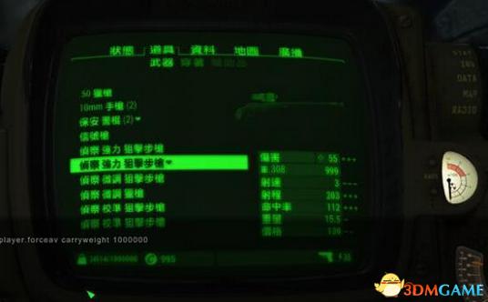 游戏中按 ~ 键,调出控制台,输入:player.forceav carryweight 9000,就是承载重量 9000。按TAB键状态栏下可以查看。