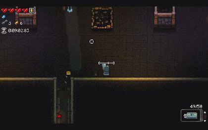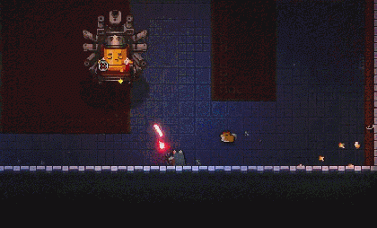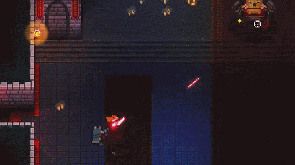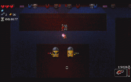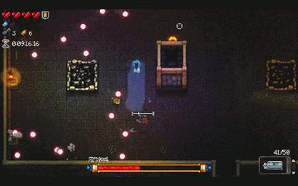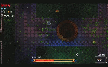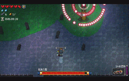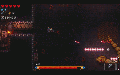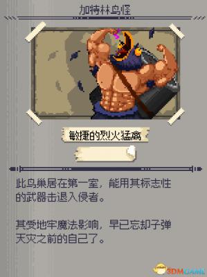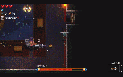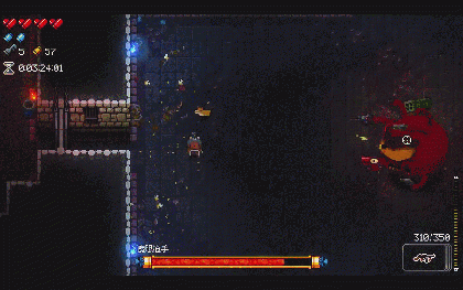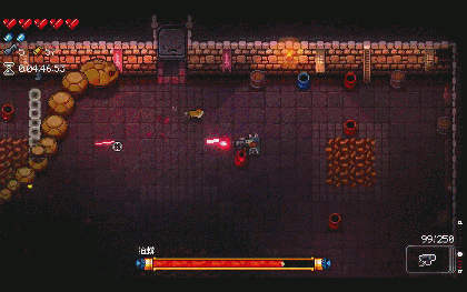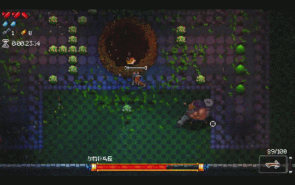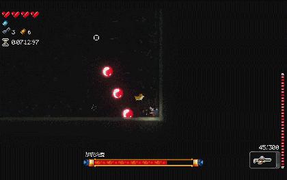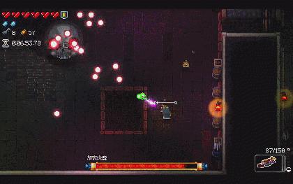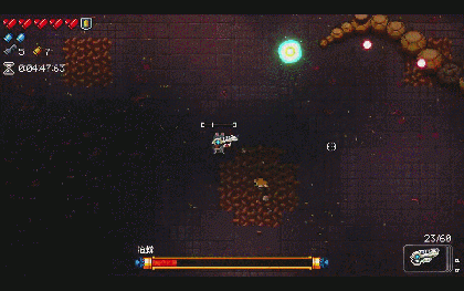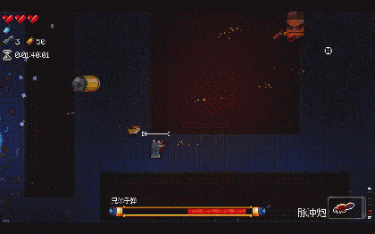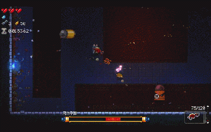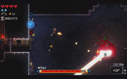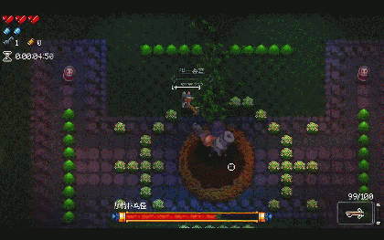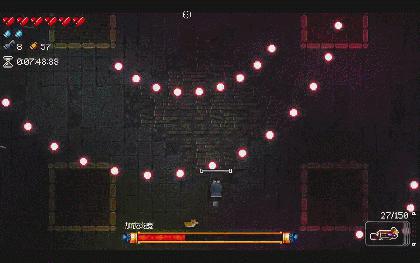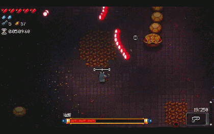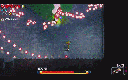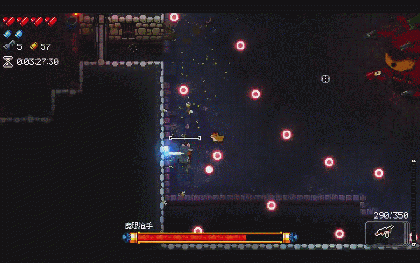 一层打起来还可以的boss,(偶尔出柱子房,仗地型绕柱子很容易打死,应该是蛮简单的就不截图绕柱子打法了)中远程打,但是boss的移动速度很快很容易造成只能是在中程打,难点在于boss的弹幕比较不规则而且会连招,导弹都还没掉落完就发其他弹幕连着一起了。加特林鸟怪释放的弹幕有: