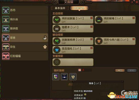新版本粉红猫猫【技能】分为主动技能,被动技能和支援技能三类。