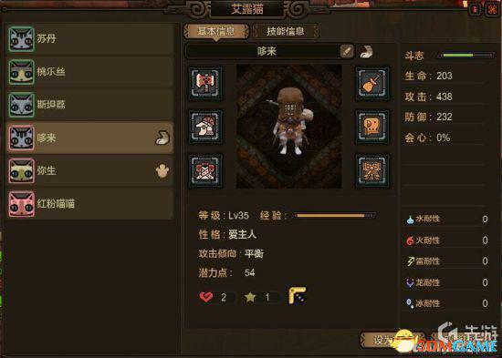 在新的艾露猫面板中,最左边是可选的艾露猫,选中后,显示相应艾露猫的属性、装备和技能