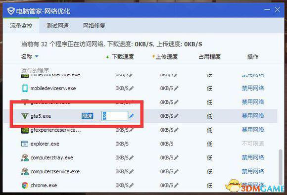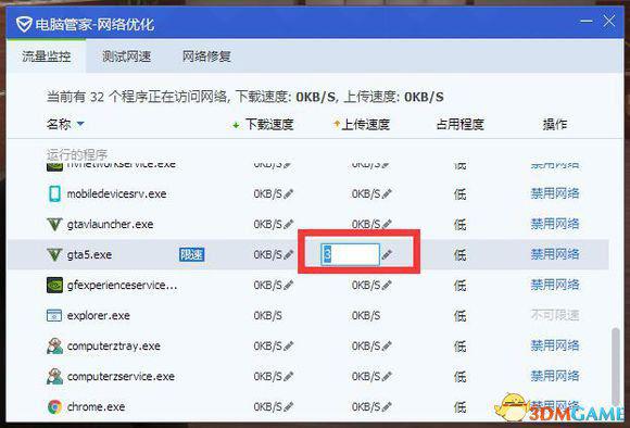 然后把GTA5.exe 限制上下传的网速3kb/s,必须3kb/s,亲测快了卡不成,慢了回失去战局联线。