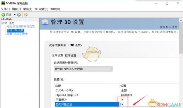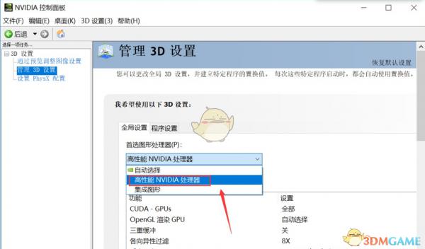 在【全局设置】我们将首选图形处理器选择为NVIDIA高性能图形处理器,如下图所示