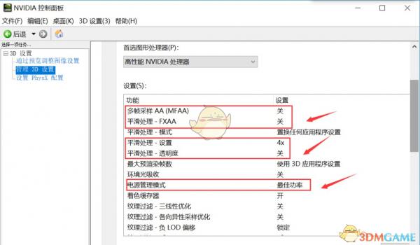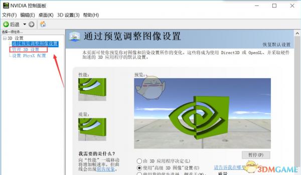 然后到【管理3D设置】,选择【广域设定】,之后在下拉菜单中选择【高性能NVIDIA处理器】。