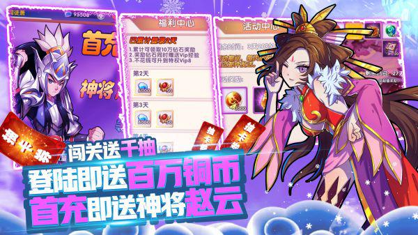 登录送88888钻石,铜币888W,再送V10,海量资源免费送!登陆闯关就送100抽,累计可领1000抽!天下大势,合久必分,梦回三国之时,多少风流人物,你又是否想过自己成就一番宏图霸业?这一次《运筹三国》为你还原乱世之景,这里有独特的九宫格战法让你施展谋略,刘关张等多名英雄武将随你征战沙场。符文洗练、英雄专属装备、超炫合体技等多维度培养方式让你手下的武将快速成长!收集家园材料开国建城,还有宠物上阵助您实力超群;多重跨服争霸玩法,多种社交情缘玩法,与跨服对手的一较高下,开拓您专属的霸主之路!