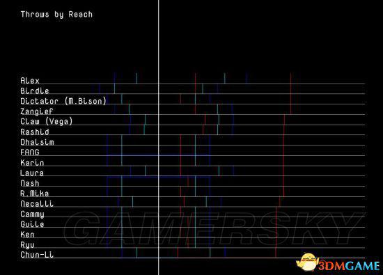另外附上一张全角色的投技距离图片。红线代表投技的距离长短,白线是角色建模的中心,蓝线则是此时你可以被攻击到/投到的距离。