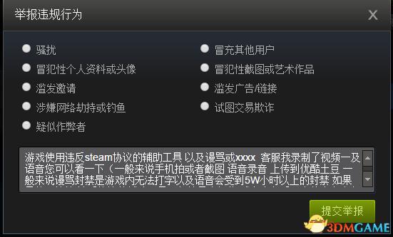 非steam用户也可以登录网页版进行举报,步骤基本相同。点自己ID再点击好友,找最近进行的游戏,找你要举报的那个人,前排提示,一般录音、视频、截图请上传到优酷土豆,或者国外主流的流媒体免费云空间去哟。