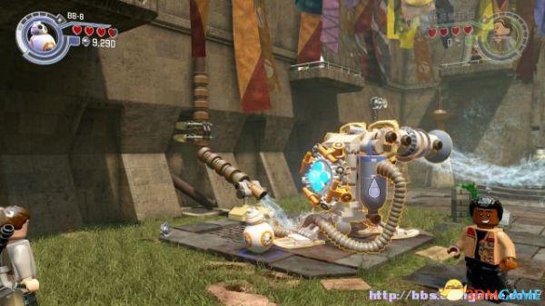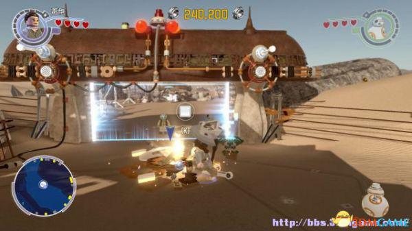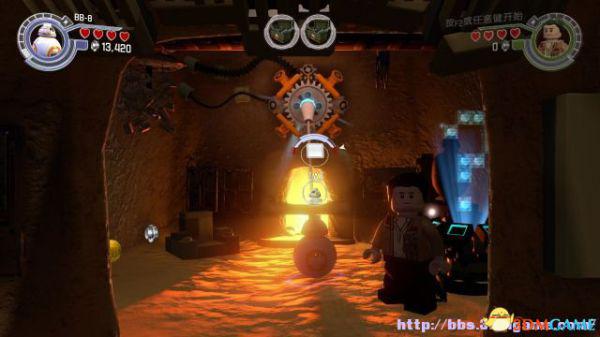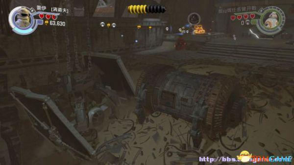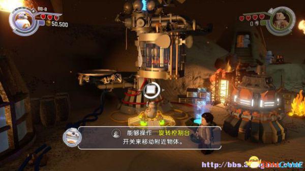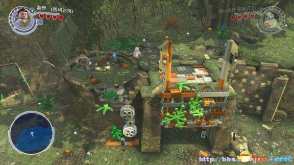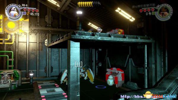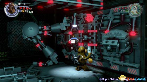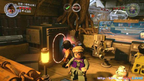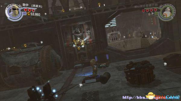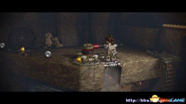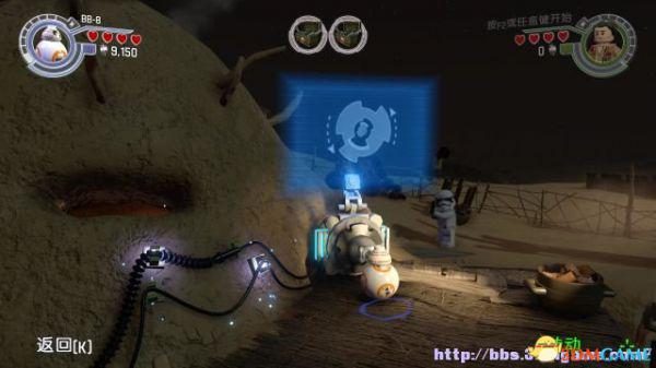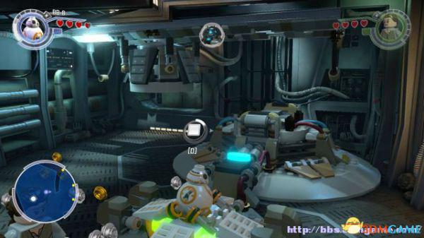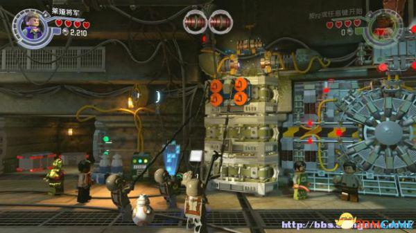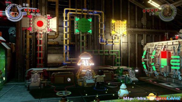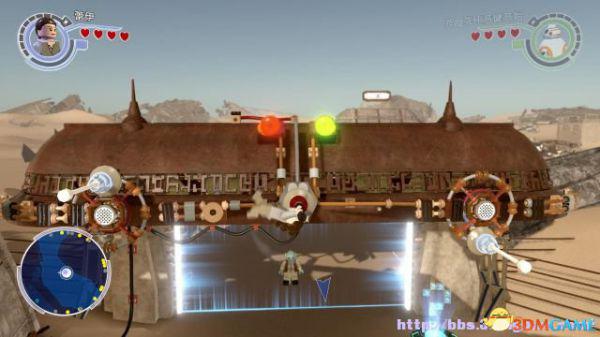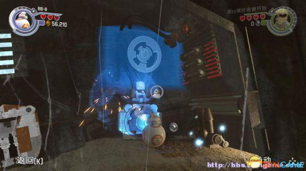 先让楚巴卡用炸弹摧毁蓝色、绿色装置前的金属杂物,就可以堆砌出一个控制器,让BB8跳上去,然后往右转动,就可以将仪器重新安装。