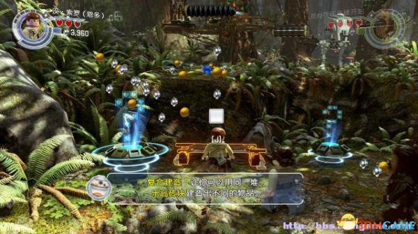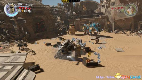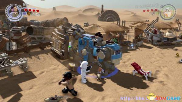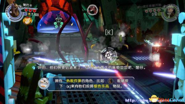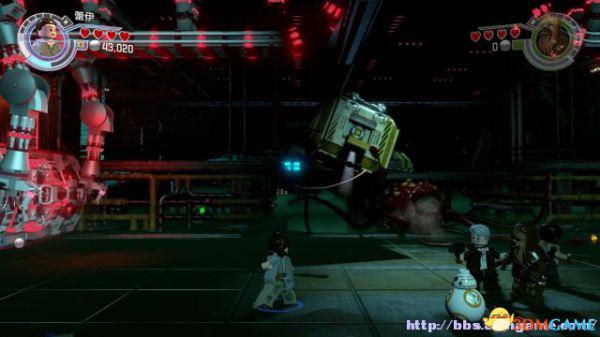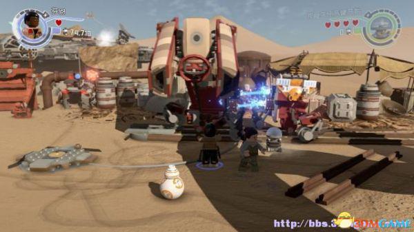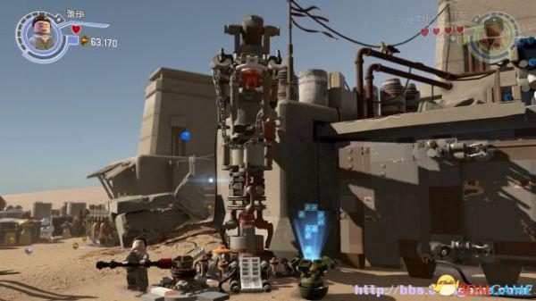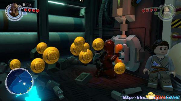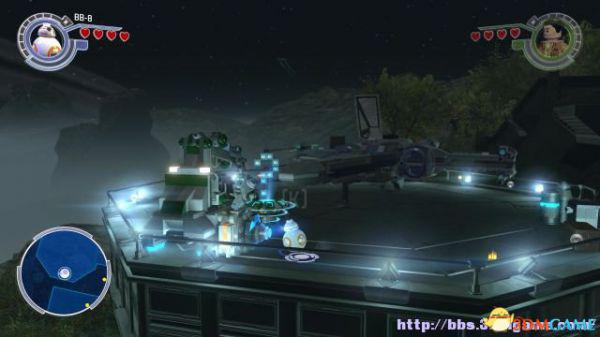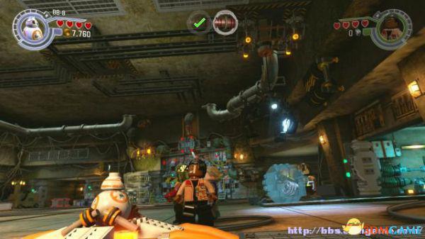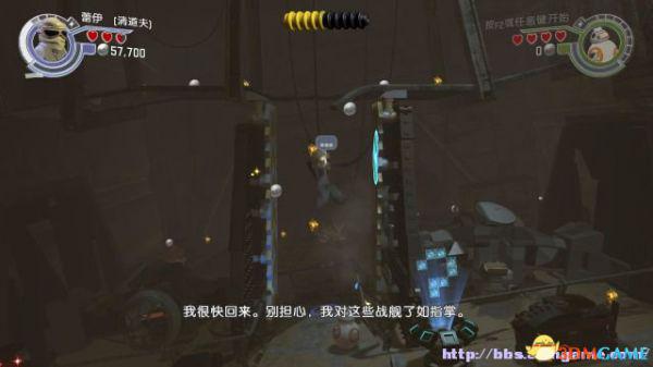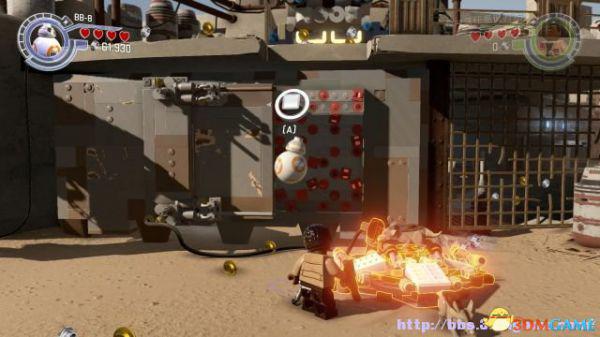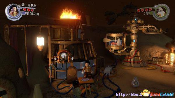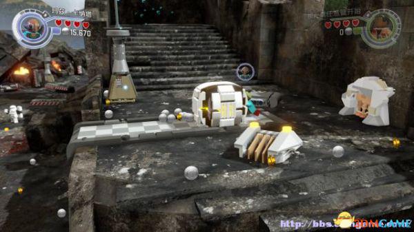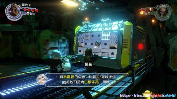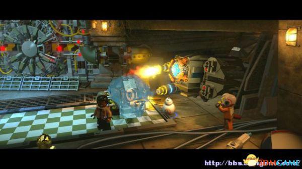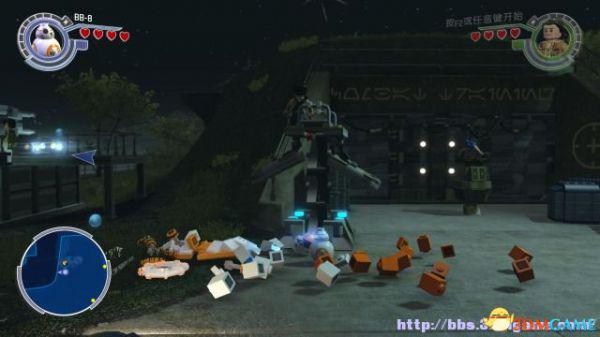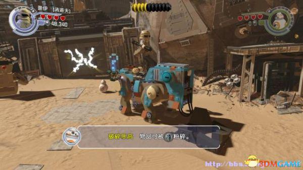 先让楚巴卡用炸弹摧毁蓝色、绿色装置前的金属杂物,就可以堆砌出一个控制器,让BB8跳上去,然后往右转动,就可以将仪器重新安装。