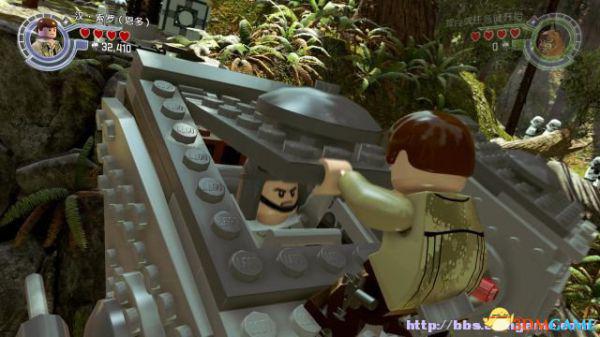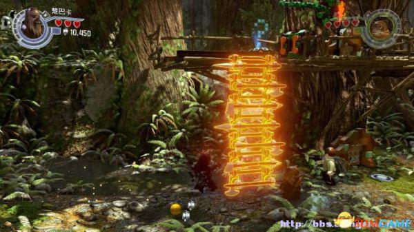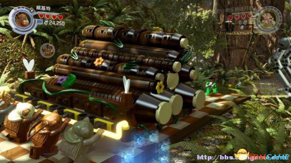 然后切换为楚巴卡,利用树干破碎后得到的乐高砖块制作成一条木板供大伙走到上层。