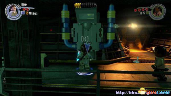 切换为汉·索罗,使用鞭子摆荡至一台步行机器人头顶,此时会出现一个读表,看准黄色的箭头游码落在蓝色位置上就按K键,连续按3次,就能够掀开步行机器人顶盖,将里面的机师抓出来,那么汉·索罗便能操控一台步行机器人(玩家2可以操控另外一台步行机器人)。