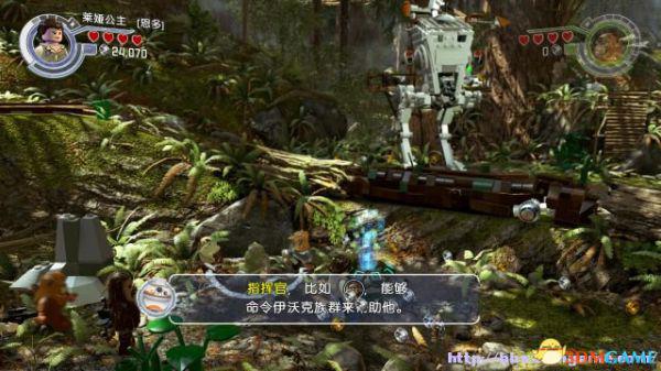 step3.去到步行机器人左侧,切换为汉·索罗,使用鞭子将树上困住威基特的网扯下来(按一下K键后,用鞭子拴住,然后连续按K键),那么威基特就会加入到队伍当中。