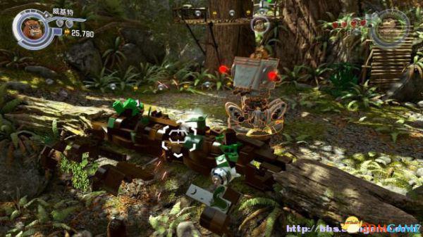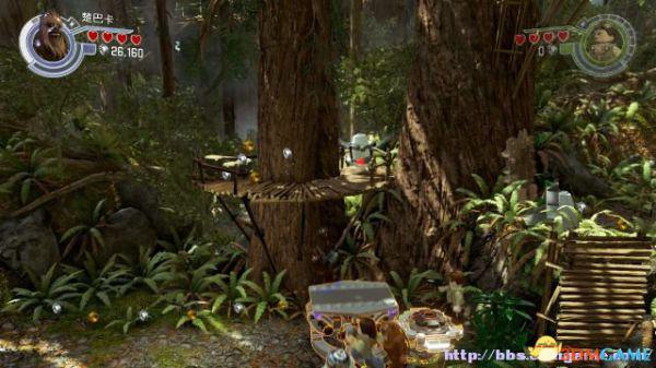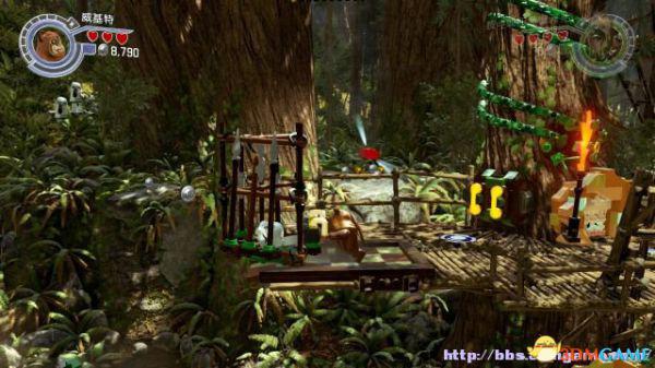 然后摧毁这个用长矛困兽笼乐高制成的爬梯,再利用这些乐高砖块往右侧(D键)砌成连接大树露台的梯子,供楚巴卡爬上去,并拉扯装置,抬升步行机器人左侧大树上的悬吊树干。