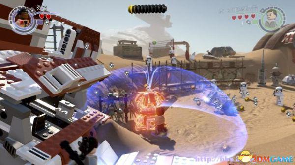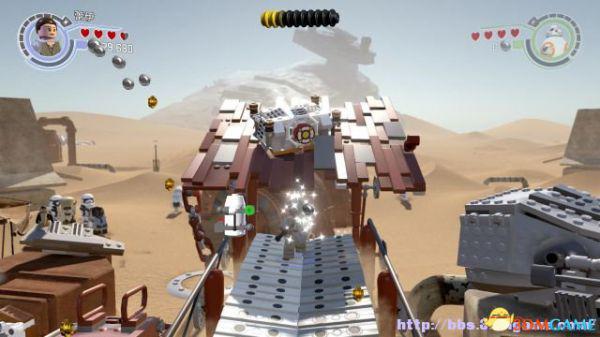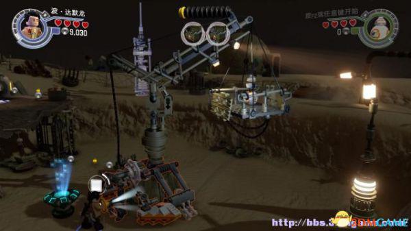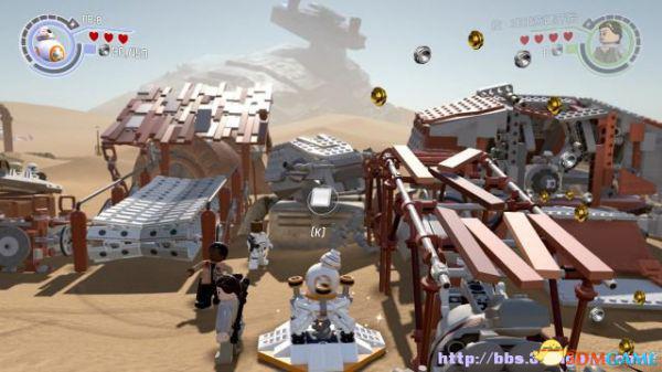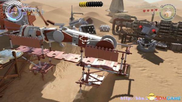 step2.接着前往远方的停机坪,这里有名工作人员不慎摧毁了台阶。利用台阶碎裂后的乐高碎片在右侧搭建了一个发射台,切换为波·达默龙,让他站在平台上,然后让BB8摧毁装置,那么平台就会升回高处,波·达默龙就可以拿到金砖块。