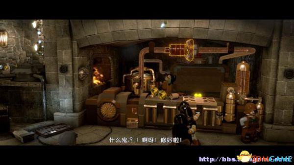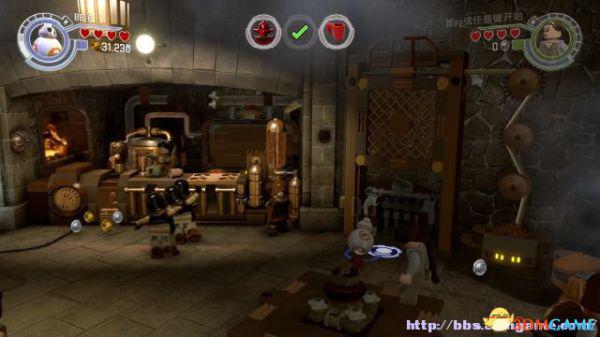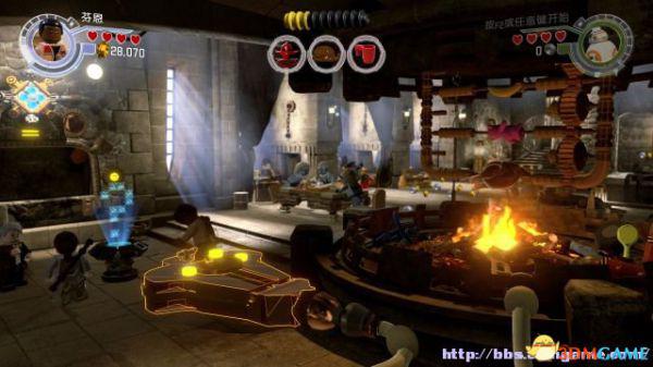 step7.接着走到刚才那名大块头外星人旁边的壁炉前,切换为汉·索罗对壁炉上方使用检测镜,然后切换为BB8对上方的齿轮灌输电量,那么壁炉的乐高砖块就会弹出。