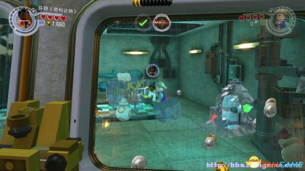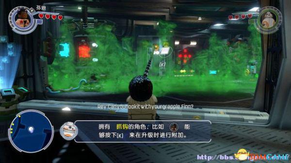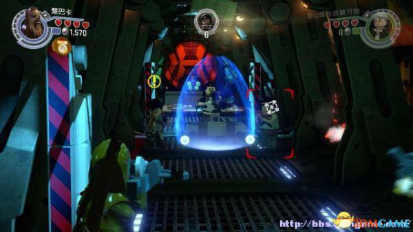 step6.来到大厅的右侧,这里的玻璃房间内有第二批抵抗组织成员,让C-3PO操作玻璃窗外的声音辨识终端,就可以把房间的门打开。
