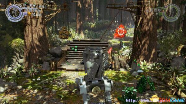 step8.威基特沿着树干滑落的斜坡去到桥面上,将刚才摔碎的步行机器人的乐高砖块往左侧(A键)堆砌成一个炮塔,按U键坐在炮塔上将桥面上挡路的树干摧毁掉,并且解救出压在树干下的R2-D2。