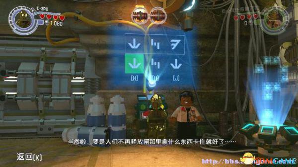 首先去到闸门左侧,让C-3PO操作终端机,进行图形吻合的解谜,当下方栏对位出现与上方栏一致的图案就按下对应的按键,务求令到上下栏的图形一致就可以成功解密。