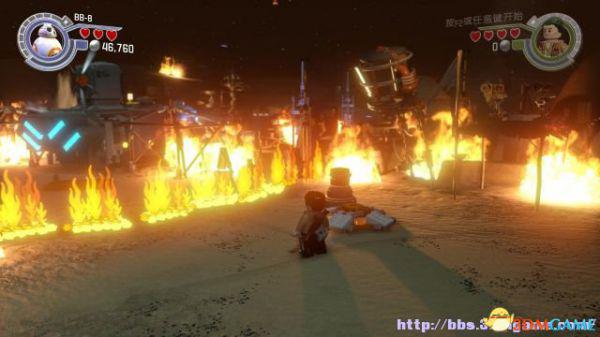 然后拆除秋千获得乐高砖块,在水塔左侧堆砌出一个发射台,让BB8站上去,然后发射令到水塔倒塌,那么就能够浇灭旁边的火。