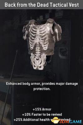 在普通(normal)及以上难度下,被击倒的人是有濒死时间的,也就是复活有效时间。这个装备可以使你有更多的时间让队友有机会复活你。