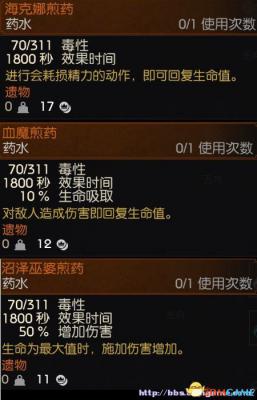 另一瓶煎药随意选择。协同作用技能激活后,4瓶煎药可以提高4000点生命值上限至于为什么不用忍耐疼痛是因为 虽然+的血上限更多 但是耐性提高不掉血下 是没效果的,如果用忍耐疼痛掉血了就没有生命值全满提高的伤害,所以抛弃,生命回复+瘾头210±20%+雷霆+怒气爆发提供的伤害非常客观。