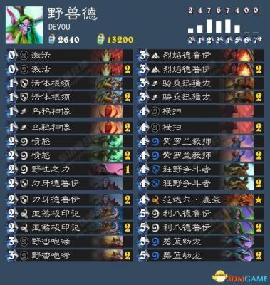 这是一套中速德鲁伊,费用最高到5费,有之前快攻铺场德的影子。依靠前期小德野兽随从身材和数量上的优势占场,亚煞极印记是非常关键的一张牌,另外中期紫罗兰,鹿盔帮助你再占一波,而野蛮咆哮作为终结手段突如其来地结束比赛。