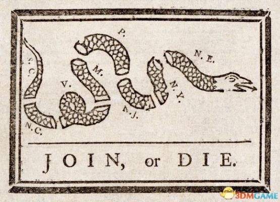 是本杰明·富兰克林在1754年5月9日发表在《宾夕法尼亚日报》上的一幅具有政治性质的漫画,七年战争期间1754—1763)他为了推动殖民地各州团结,画出了上面这幅漫画,旗帜中的一条蛇被分成8段暗示着当时沿海岸的13个英属殖民地