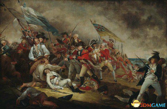 碉堡山战役:即邦克山战役,被包围的英军迫切需要占领制高点来扩散视野,一分钟人也有同样的想法,双发在碉堡山上发生战斗。一分钟人的其中一位首领威廉·普雷斯科特判断失误,命令一分钟人“等看到敌人的头再开枪”,放弃了之前的边跑边打战术与英军对轰,导致失去了碉堡山,同时另一位一分钟人首领约瑟夫·瓦伦(Joseph Warren,图中坐在地上的白袍人)战死。但即便如此,英军也失去了1000名士兵的性命,而一分钟人仅付出450人的代价便让英军放弃了再次进军的打算