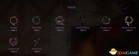 都是稍微正常点的鞭子,灼热缚索鞭和链钉绞索虽然是属性武器,但是由于带霸气威武的Chain Whip特效(鞭子独有效果,增加10%伤害),勉强归为二类鞭。