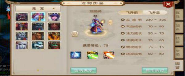 1、需要消耗鬼气,可对鬼宠的气血、物伤、法伤、速度、防御进行提升;