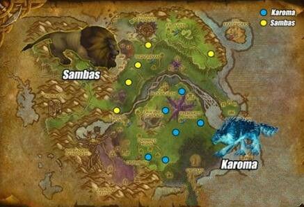 暮光高地,蓝色的点是卡洛玛,黄色是桑巴斯(幽灵狼)。