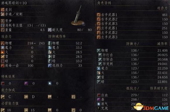 都说好用,第一时间刷了一把,长度不是一般的长,感觉这玩意快赶上大剑了,偏偏系统硬是说他是直剑。低级别的时候感觉厚重质变不咋地,熟练质变也一般,但是游魂质变后伤害就爆炸了,而且敏30的情况下伤害超过了老婆剑,由此看来两把剑的敏捷补正都是D但是暗黑剑的补正更高一点。要说唯一的不足,就是战技太垃圾,破盾难。还有就是精耗超大,30持久只够砍满7剑,算上躲避的体力只能砍6剑。
