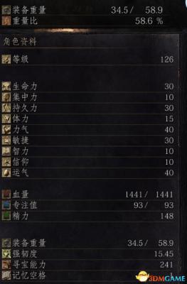 一周目,游戏时间50小时,刷了一会儿金三胖,126级,加点图如下