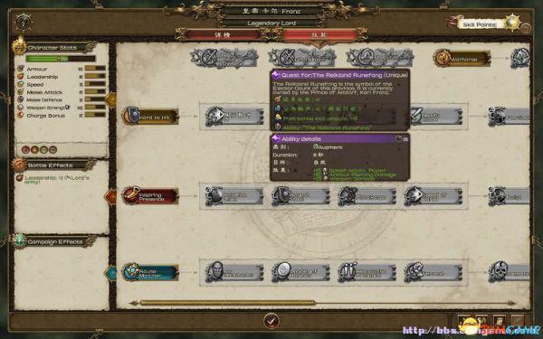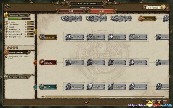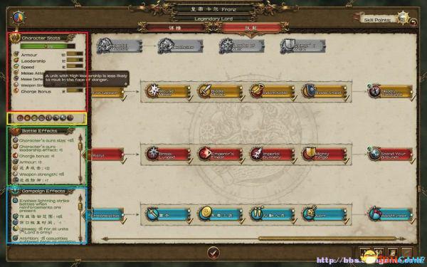 不同的领主拥有不同的战场技能(红框)以及对派系的影响效果(蓝框)。